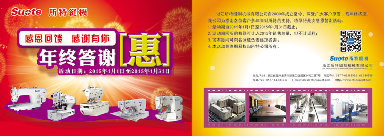 浙江所特縫制機械有限公司自2000年成立至今,深受廣大客戶厚愛,現年終將至,我公司為感謝各位客戶多年來對所特的支持,現公司將拿出電腦平車600臺,電腦平頭鎖眼機50臺進行感恩答謝活動。