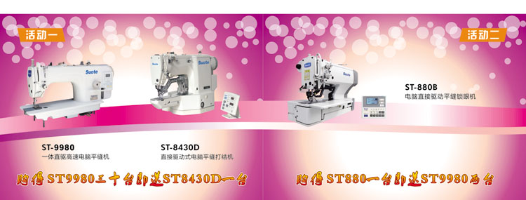 1,活動期間夠得電腦平車ST-9980三十臺即送電子套結機ST-8430D一臺;購得電子平頭鎖眼機ST-8800B一臺即送ST-9980兩臺