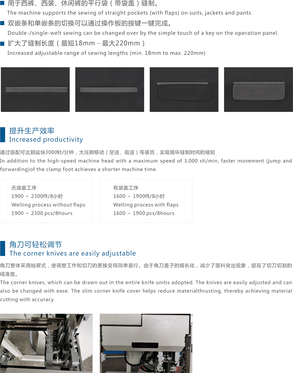 用于西褲、西裝、休閑褲的平行袋(帶袋蓋)縫制。