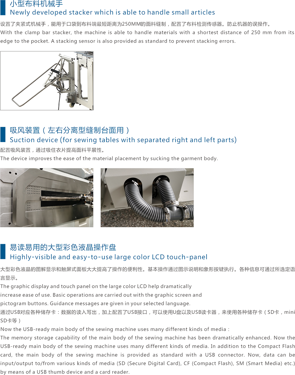 The machine supports the sewing of straight pockets (with flaps) on suits, jackets and pants.